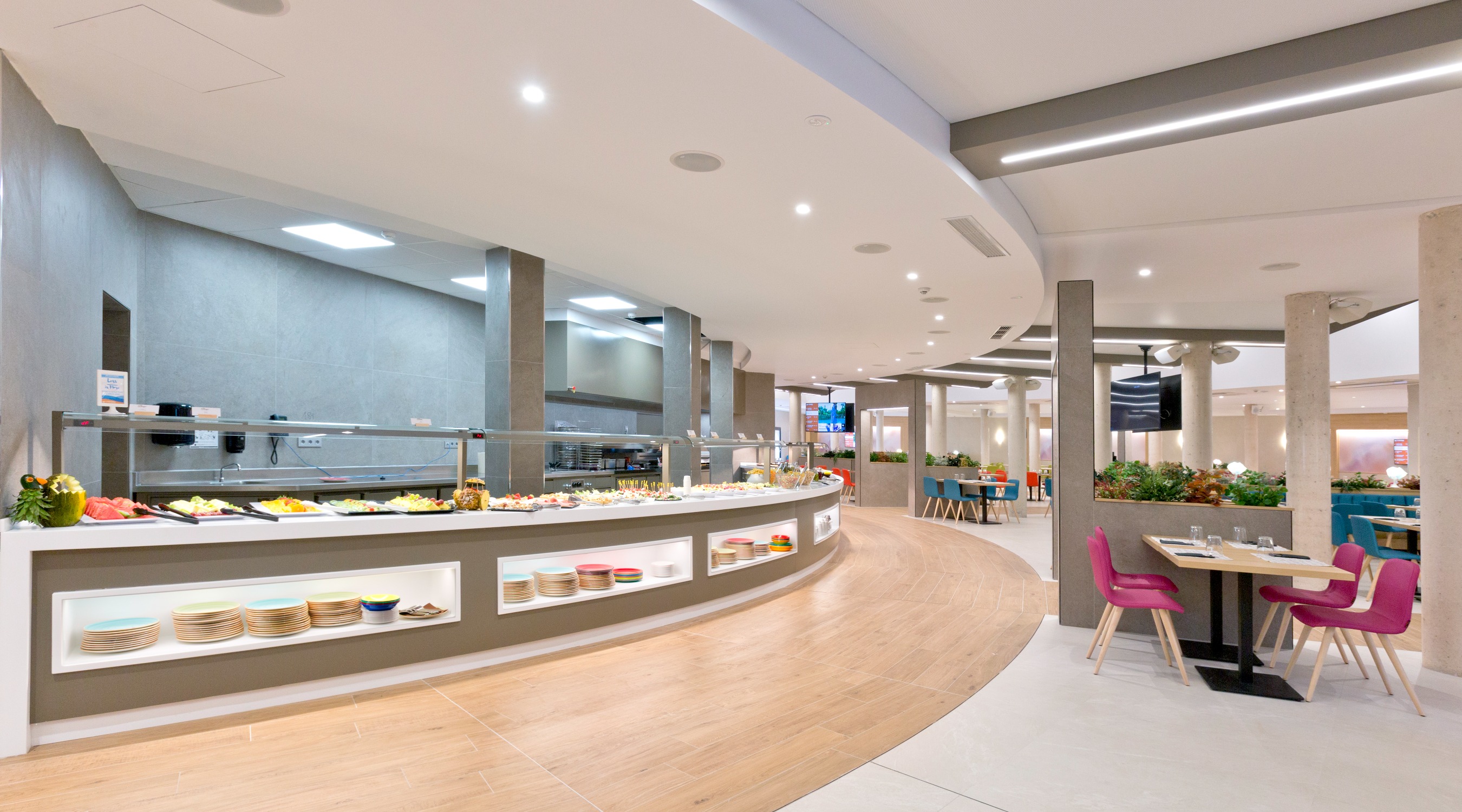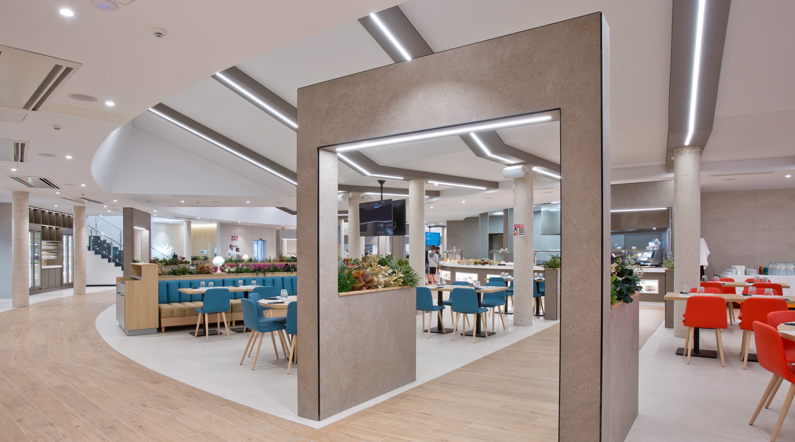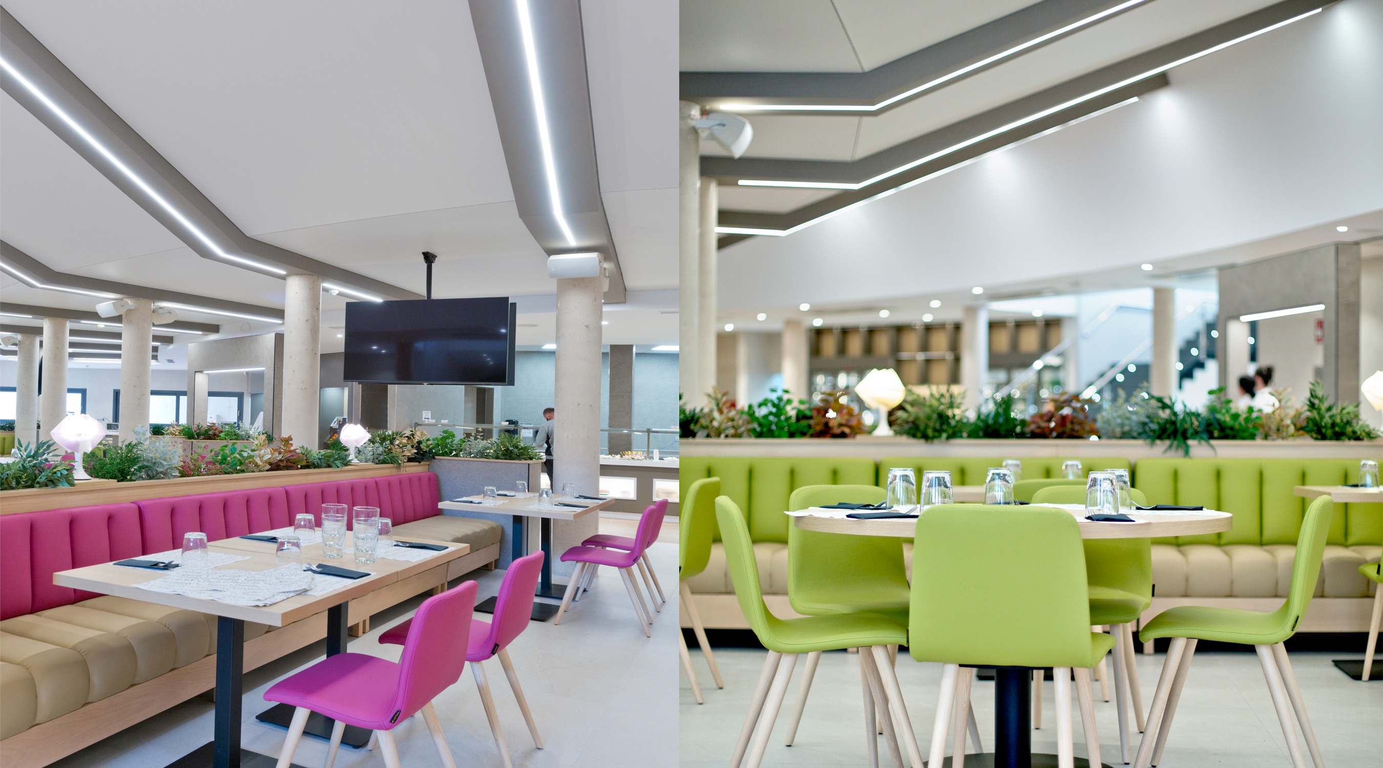Resultado A nivel técnico, conseguimos una gran superficie ordenada, con una correcta sectorización, espacios amplios y juego de volúmenes en el techo con la estructura de soporte de las gradas. Y de cara a la cantidad de usuarios que pudiera albergar el buffet, hemos tenido especial atención a la acústica del local con techos tensados acústicos. Además, los cambios en el pavimento entre zonas de circulación y salones, junto con distintos colores según el salón ayudan a generar orden dentro del conjunto. |