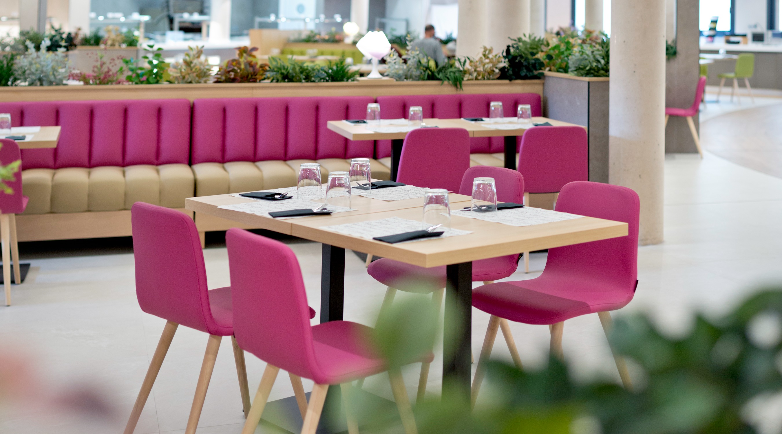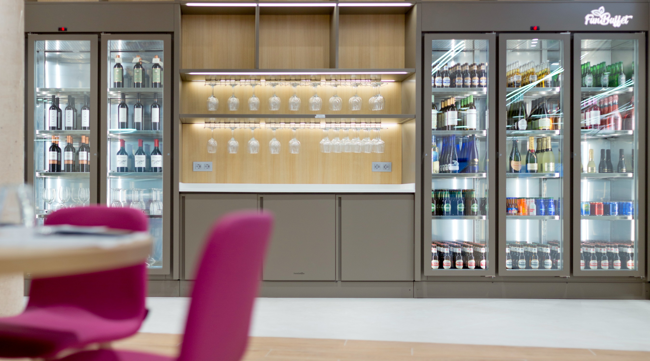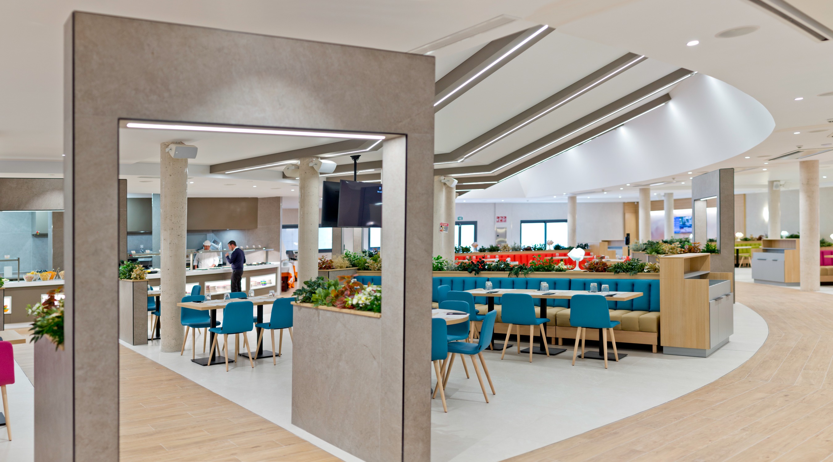 Resultado A nivel técnico, conseguimos una gran superficie ordenada, con una correcta sectorización, espacios amplios y juego de volúmenes en el techo con la estructura de soporte de las gradas. Y de cara a la cantidad de usuarios que pudiera albergar el buffet, hemos tenido especial atención a la acústica del local con techos tensados acústicos. Además, los cambios en el pavimento entre zonas de circulación y salones, junto con distintos colores según el salón ayudan a generar orden dentro del conjunto. |