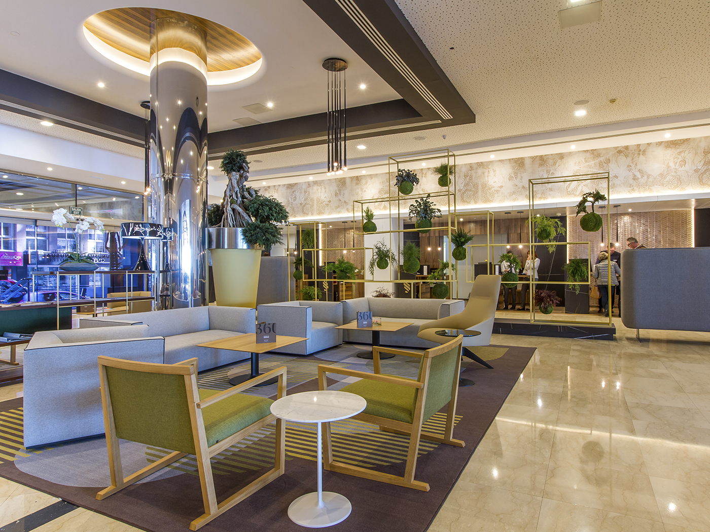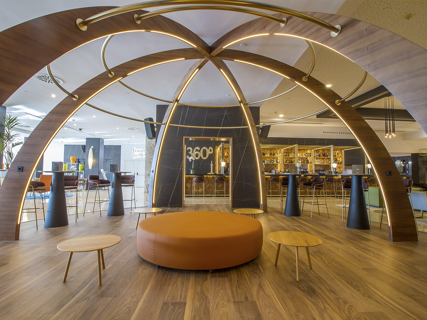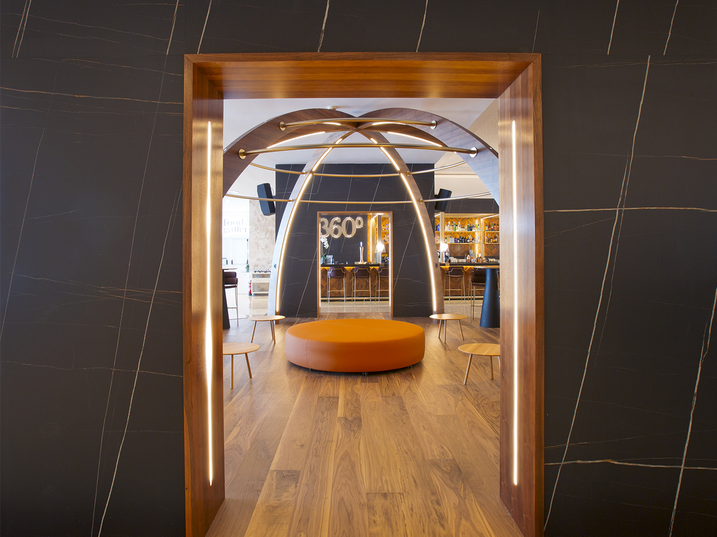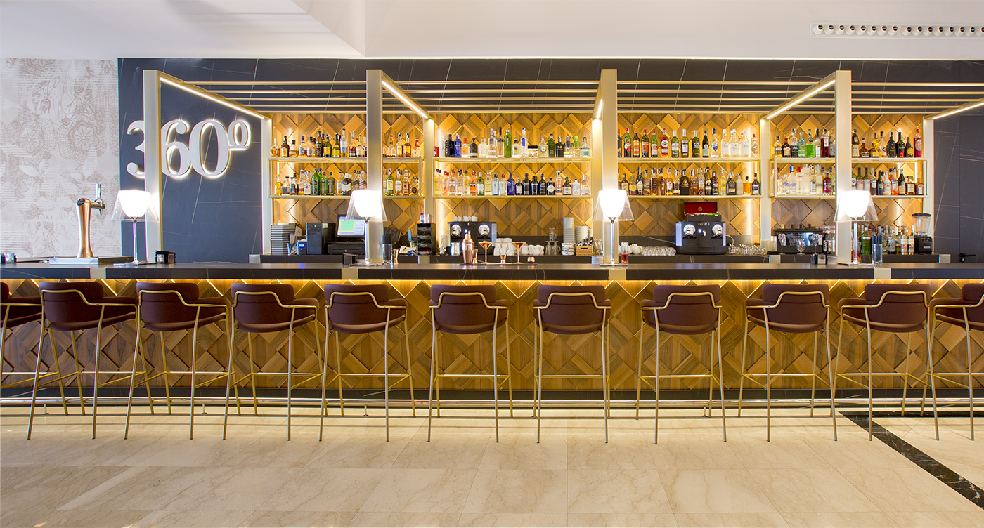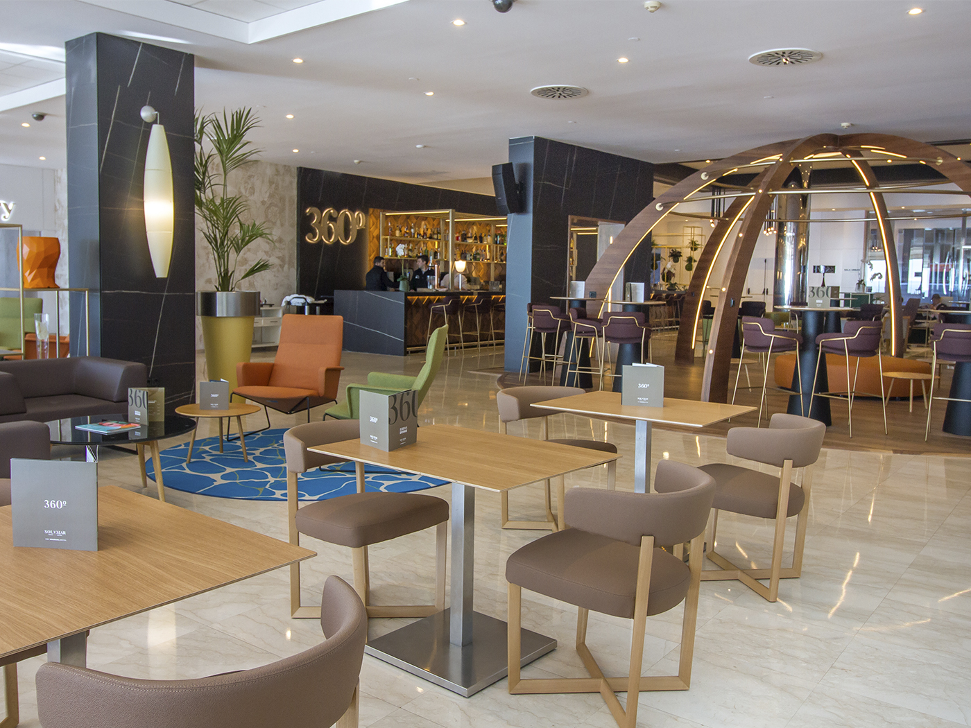 La nueva ubicación de la barra del Lobby Bar configura un nuevo espacio donde adquiere gran protagonismo la cúpula central con forma de iglú que da nombre al Bar 360º. Esta estructura vertebra el conjunto del lobby en distintas zonas.