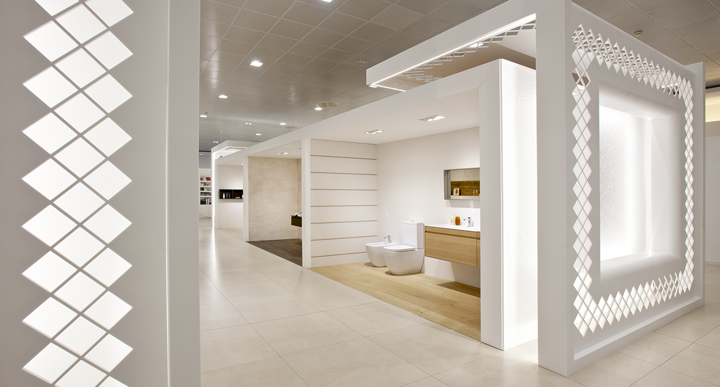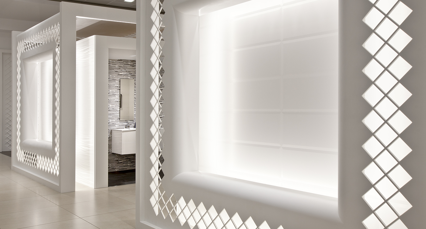 Para la exposición de los revestimientos cerámicos diseñamos unos espacios delimitados con el objetivo de conseguir un efecto similar al ambiente donde se van a aplicar estos materiales. Este conjunto de ambientes queda realzado en sus partes laterales por una celosía de krion, que también utilizamos en la sala de formación junto con los materiales XLight y Link Floor.