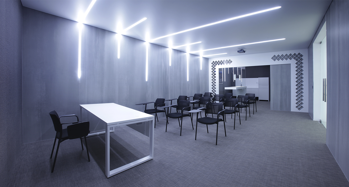 Espacios expositivos con gran protagonismo de producto, sala de formación con atractivos materiales del grupo y techo tensado con gran confort acústico.