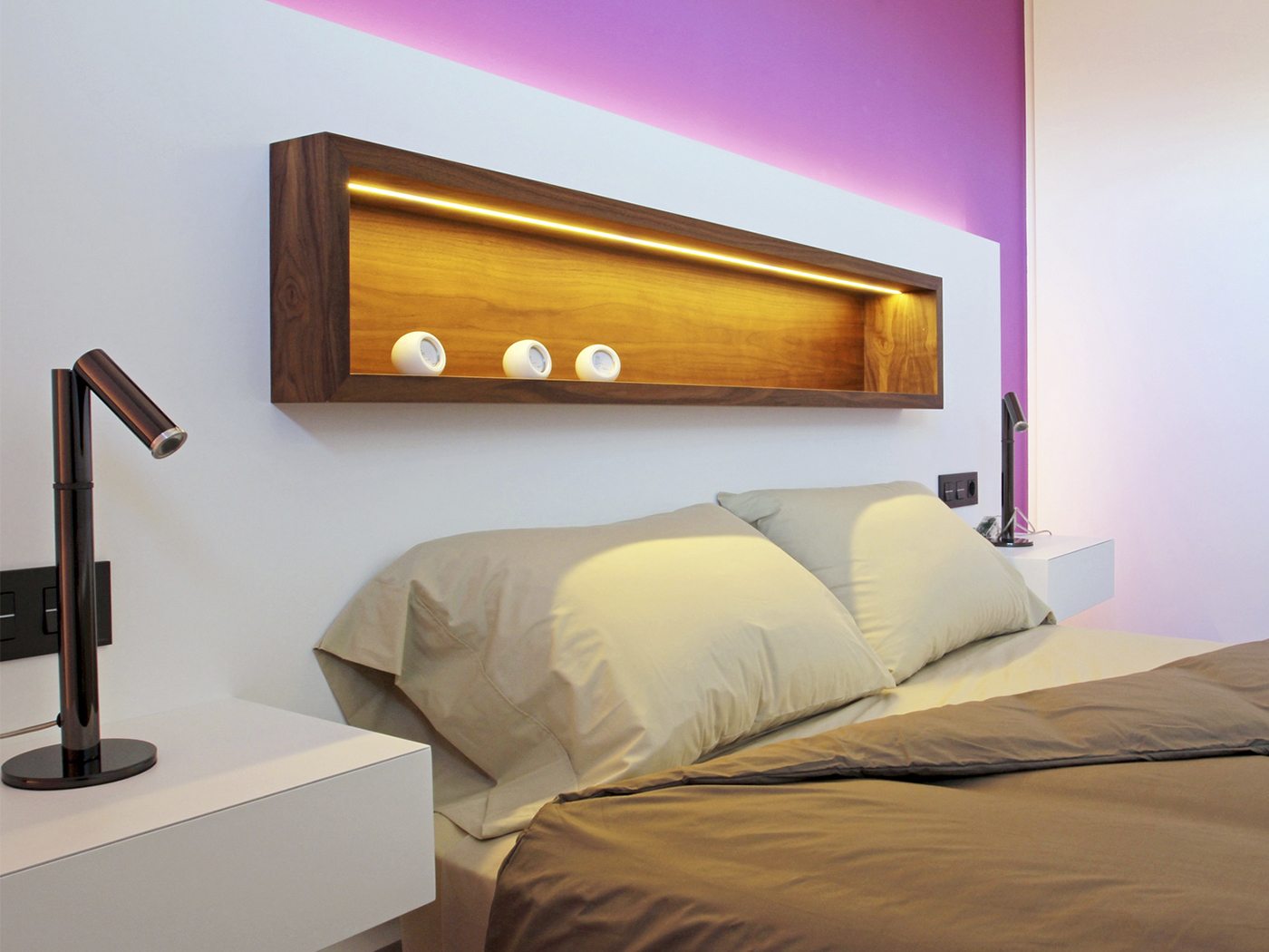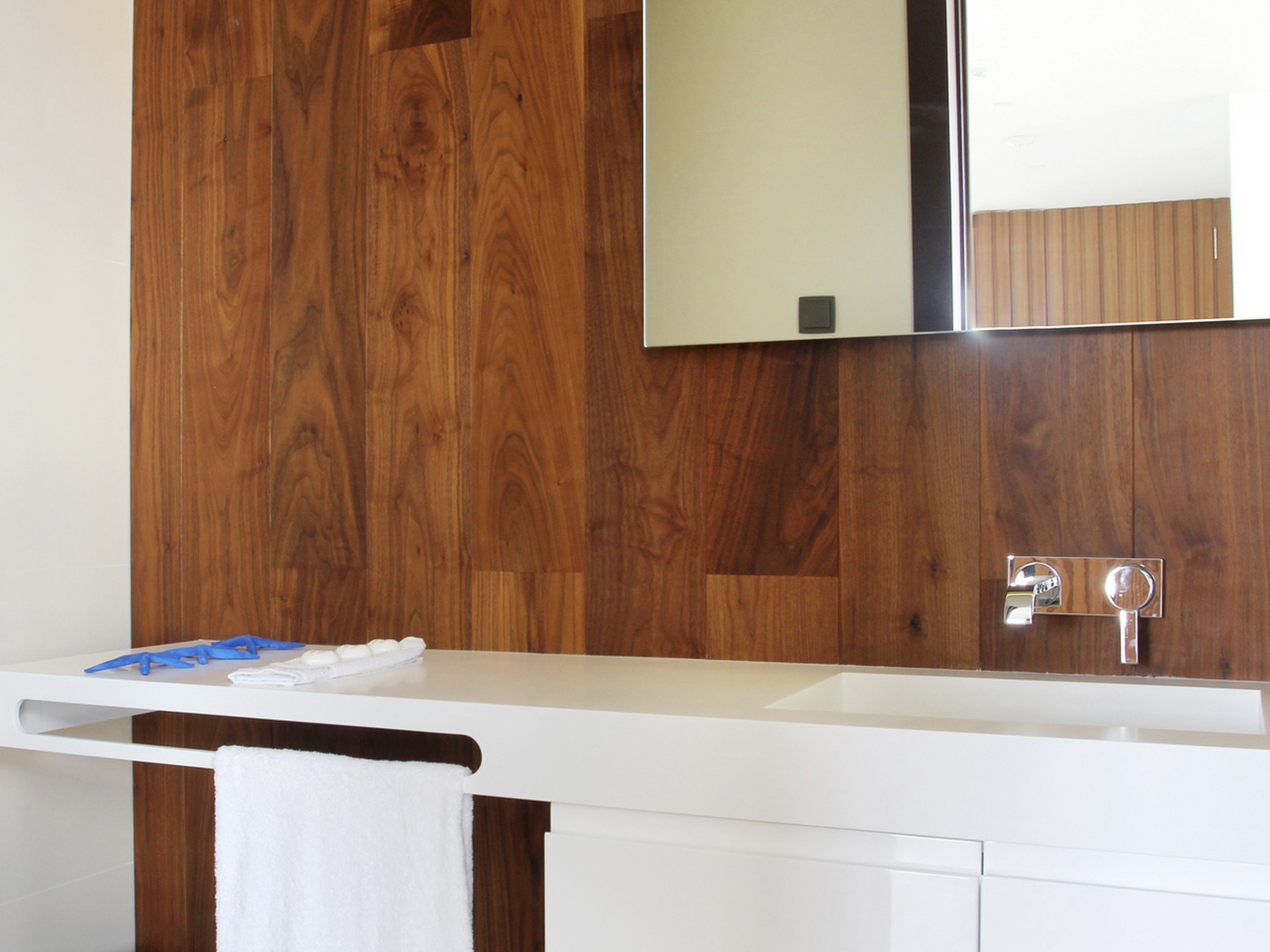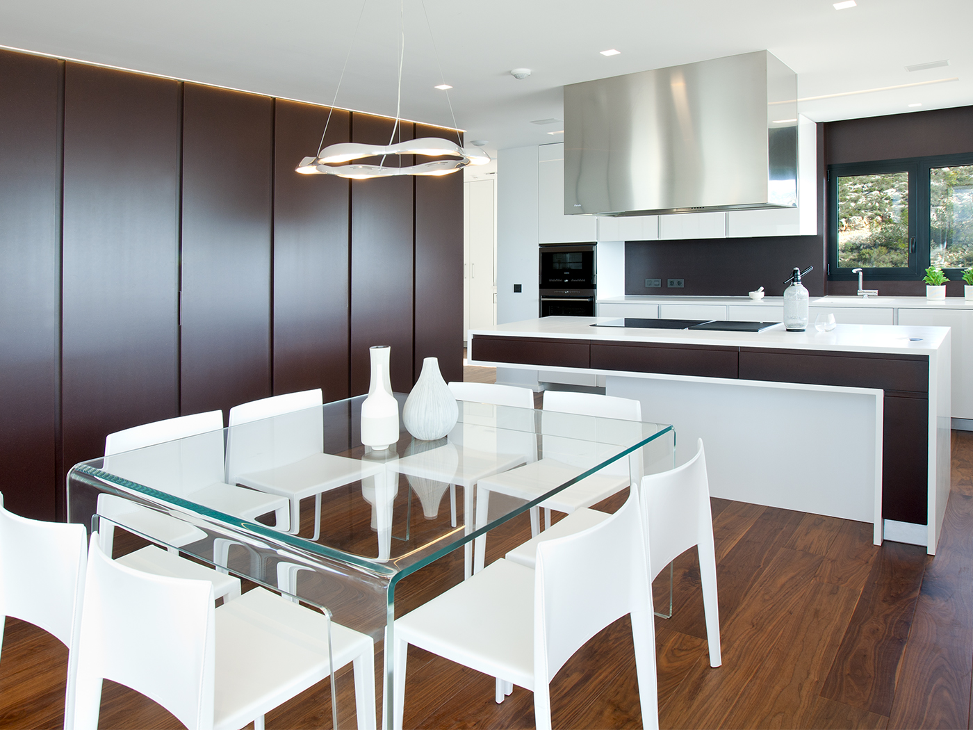 La unión de las zonas de día y la combinación de materiales como la madera de Nogal Negro Americano, el revestimiento Valchromat Chocolate Brown y los acabados lacados blanco mate han sido una apuesta segura para generar el espacio deseado.